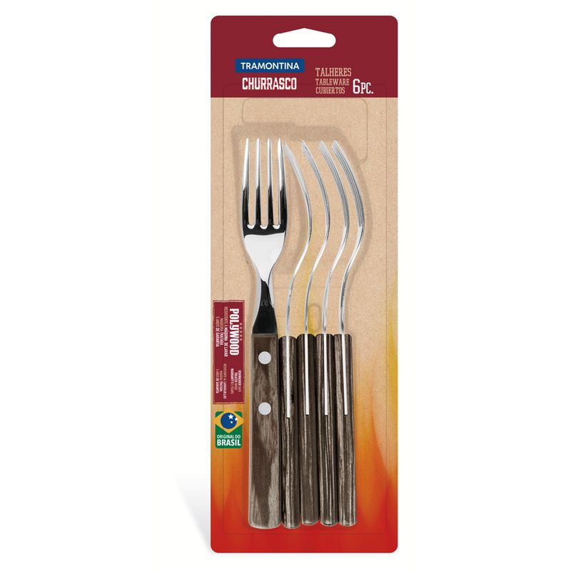 Brinda a tus invitados la oportunidad de degustar los mejores asados con la practicidad que ofrece la línea Churrasco. El juego de tenedores para asado Tramontina de acero inoxidable con mangos de polywood café de 6 piezas trae calidad y belleza a su mesa. Producida con hojas de acero inoxidable, con mangos de madera tratada Polywood, asegurando mayor resistencia a impactos, altas temperaturas y manteniendo sus características originales por más tiempo. Hecho para aquellos que les gusta hacer las cosas de manera diferente sin perder la elegancia.