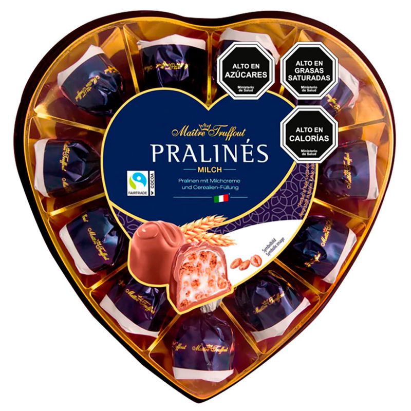 Los Bombones MAITRE TRUFFOUT corazón son un estuche de 165 gramos de dulces de chocolate finamente elaborados. Repletos de praliné cremoso, se presentan en forma de encantadores corazones, haciendo de estos bombones el regalo perfecto para demostrar amor o aprecio. Ideal para ocasiones especiales.