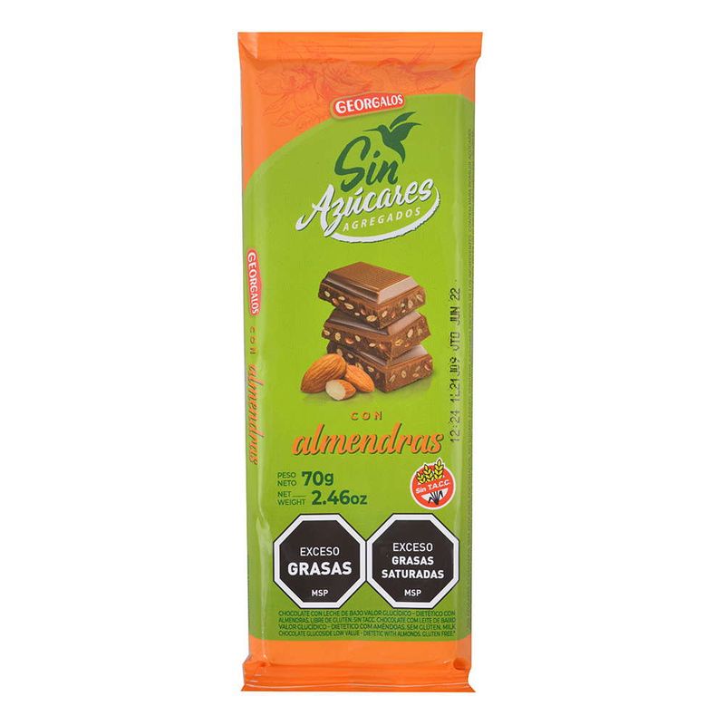 Chocolate GEORGALOS leche con almendras sin azúcar 70 g. Producto de excelente calidad.