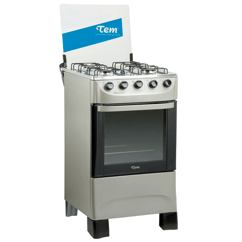 Cocina TEM aniversario silver 4 hornallas y horno gas. Características: Mesada de acero inoxidable unificada con sistema de contención de líquido; Tapa de vidrio templado; Perillas extraíbles para fácil limpieza; Quemadores de acero esmaltado para fácil limpieza; Panel ergonómico; Pies altos para mayor protección; Medidas cocina (cm): Ancho 48,5 x Prof 55 Altura 87. Horno: A Supergas. Mango metálico con apertura ergonómica; Quemador del horno alto rendimiento; Horno EasyCleaner; Sistema de aislamiento térmico manta de aluminio y doble vidrio en el horno; Medidas internas del horno (cm): Ancho 38 Prof 41,5 Altura 30,5.