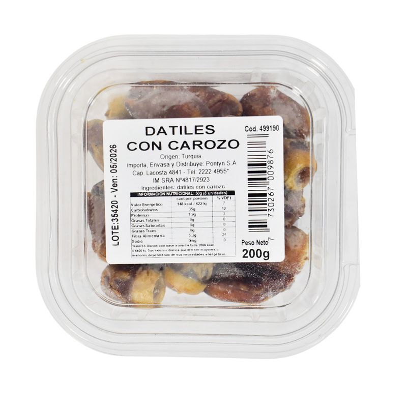 Los Dátiles con carozo pt 200g son un alimento saludable y natural, ideales para una merienda nutritiva. Son frutas secas de alta calidad, llenas de fibra, vitaminas y minerales. Su delicioso sabor dulce las hace perfectas para disfrutar solas o añadir a diversas recetas. Presentadas en un paquete práctico de 200 gramos.