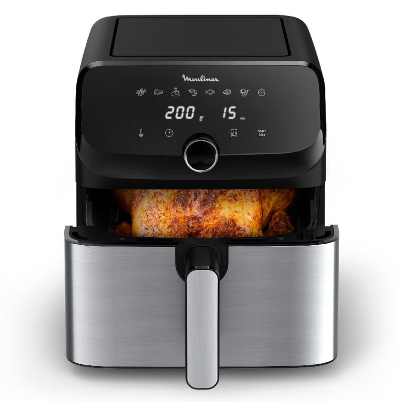 La Freidora de Aire MOULINEX Easy Fry EZ855D20 75 L es un aparato de cocina innovador que utiliza la tecnología de circulación de aire caliente para freír sin aceite, con pantalla táctil, temporizador ajustable, control de temperatura y capacidad de 7.5 L, ideal para preparar platos saludables y crujientes.