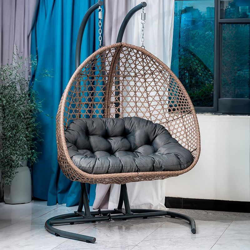 Hamaca colgante para 2 personas, fabricada en resistente ratán y acero. Diseño elegante y cómodo, ideal para jardín o terraza. Incluye cojines suaves y duraderos. Fácil de montar y mantener.