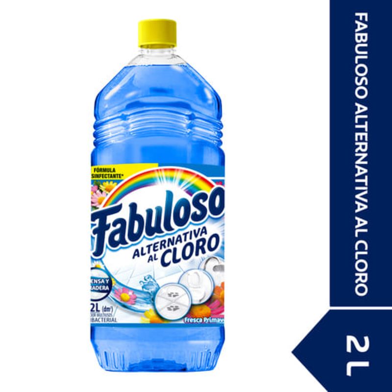 Fabuloso Alternativa al cloro es un limpiador multiusos cuya poderosa fórmula permite brindar una efectiva y poderosa limpieza y desinfección en todos los rincones del hogar. Al utilizarse, elimina las bacterias que causan malos olores gracias a su efectividad, acompañada de una deliciosa y duradera fragancia. Se puede utilizar en toda la casa quitando la grasa, el polvo y la mugre de pisos y superficies sin necesidad de enjuagarse dejándolos visiblemente más limpios. La fórmula de Fabuloso Alternativa al cloro elimina el 99.99% de las bacterias que pueden causar malos olores como E. Coli, P. Aeruginosa, S. Tiphymirium y S. Aureus.