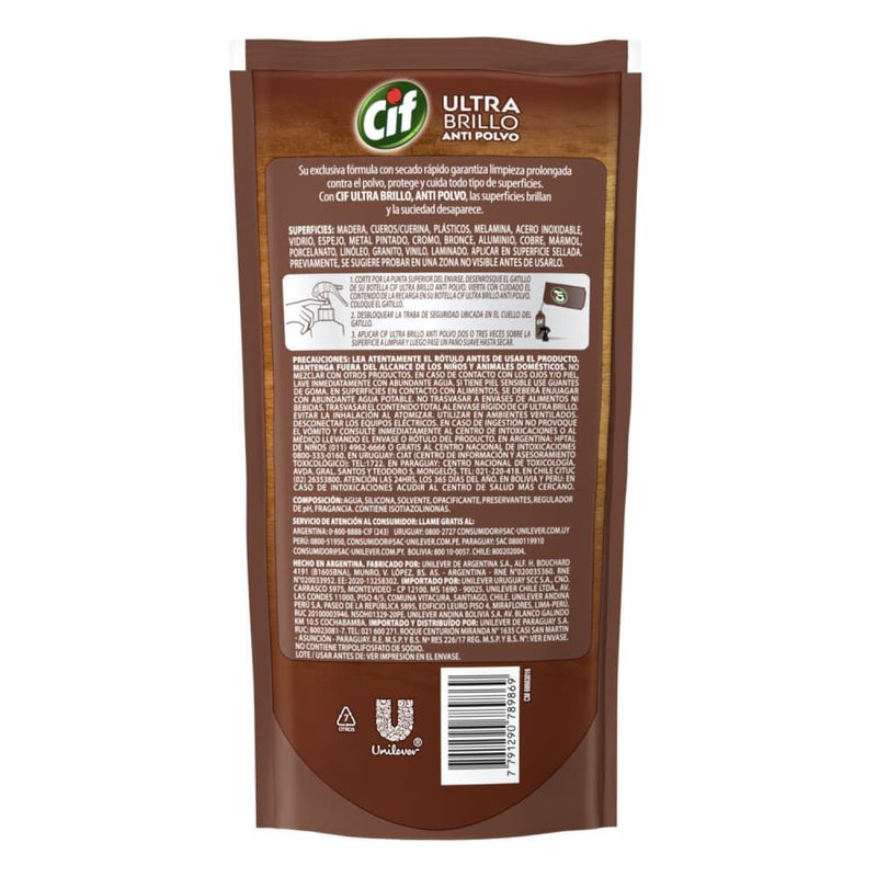 Lustramuebles anti-polvo CIF repuesto 380 ml. Producto de calidad.