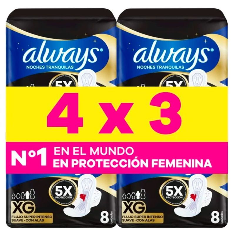 Pack 4 x 3 Toalla Femenina ALWAYS Noche Suave 8 un.