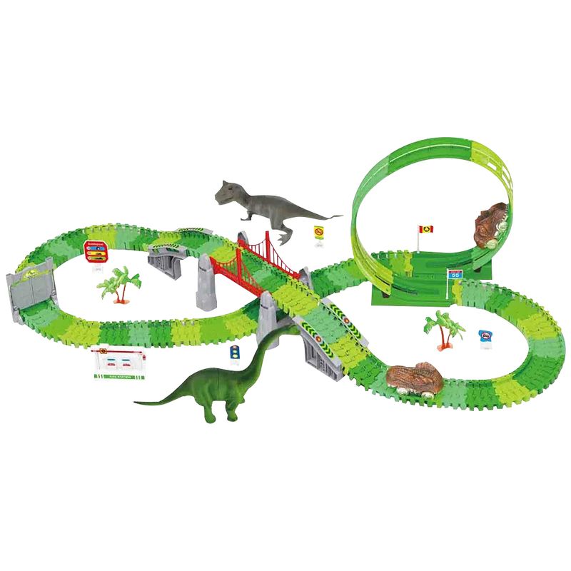 Pista DINO con looping y puente ideal para los más pequeños del hogar, los cuales lograrán desarrollar la imaginación y fomentar el juego en equipo ya que podrán jugar sólos o compartir la actividad con sus amigos. Este juego es fabricado con materiales de excelente calidad. Ideal para regalar en cualquier ocasión.