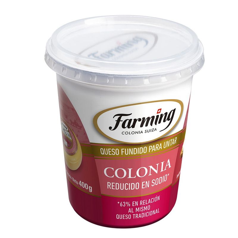 Queso colonia untable FARMING bajo en sodio 400 g. Producto de excelente calidad.