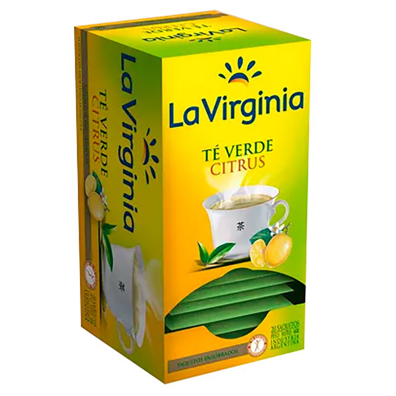 El té verde cítrus LA VIRGINIA en presentación de 20 sobres combina el sabor refrescante del té verde con un toque cítrico. Perfecto para disfrutar de una bebida saludable y revitalizante en cualquier momento.