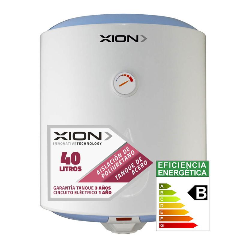 TERMOTANQUE XION 40 LTS .Dispone de acero reforzado. Su potencia es de 1500w.Contiene aislación de poliuretano inyectado. También dispone de doble nivel de seguridad por termostato. Su grado de protección es de ipx4.Sus medidas son Alto 519 mm. Ancho 450 mm. Profundidad 485 mm. Tiene garantía de 1 año en lo eléctrico y 3 en el termotanque.