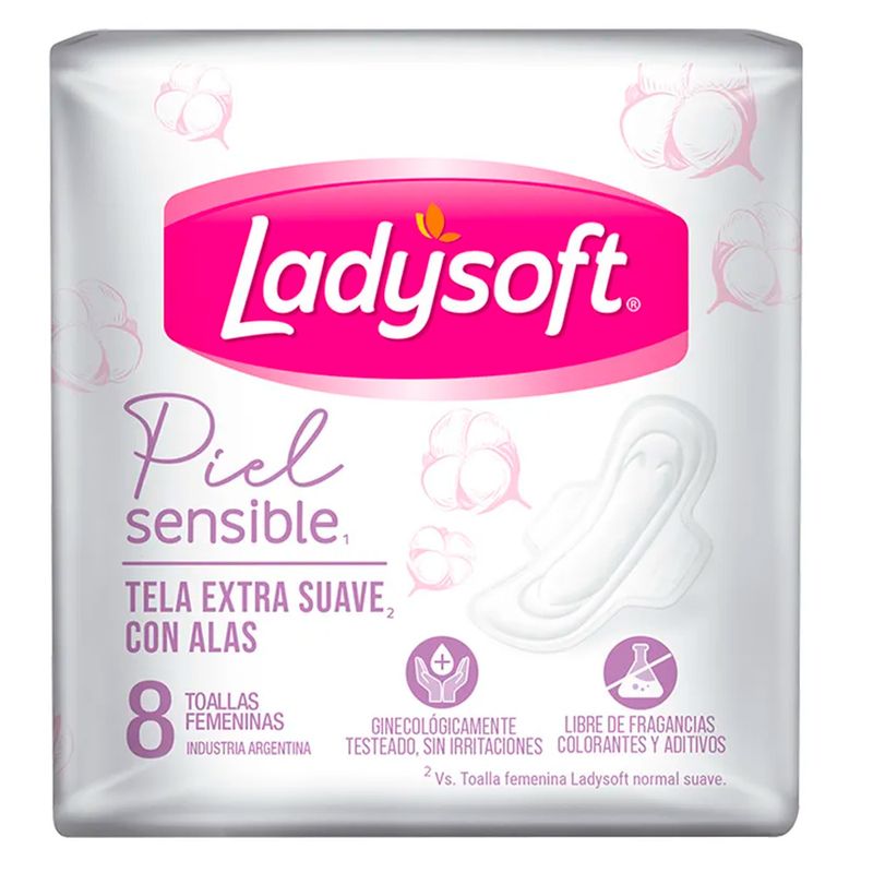 Las toallas femeninas Ladysoft piel sensible son un set de 8 unidades, diseñadas especialmente para proteger la delicada piel femenina. Tienen una superficie extra suave y absorbente, libre de fragancias y colorantes, que ayudan a prevenir irritaciones. Brindan cómoda protección durante tu periodo menstrual.