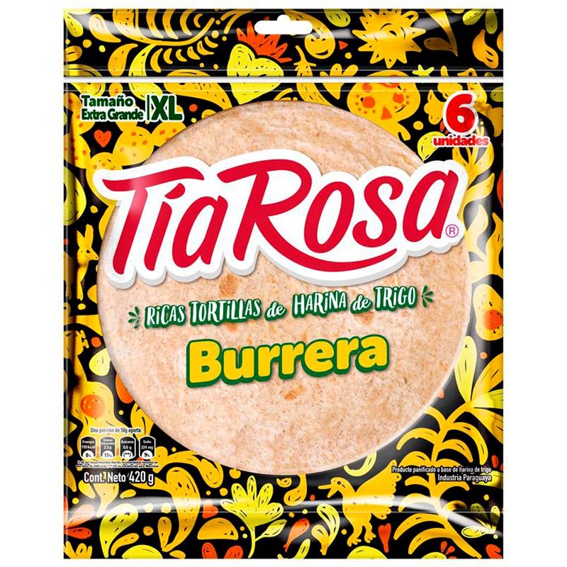 Las Tortillas Burrera TÍA ROSA de 420 g son tortillas de harina de trigo de tamaño grande, ideales para la preparación de burritos. Son suaves, flexibles y de sabor auténtico. Vienen en un paquete resellable para mantener su frescura. Producto de alta calidad.