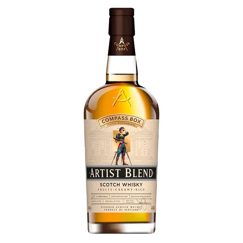 Whisky escocés Compass Box Artist Blend 700 cc: Una mezcla artística de whiskies escoceses que destaca por su complejidad y carácter distintivo. La mezcla incluye malta Clynelish, malta de Highland, de Linkwood y una gran proporción de whisky de grano Cameronbridge envejecido en barricas de roble americano de primer llenado.